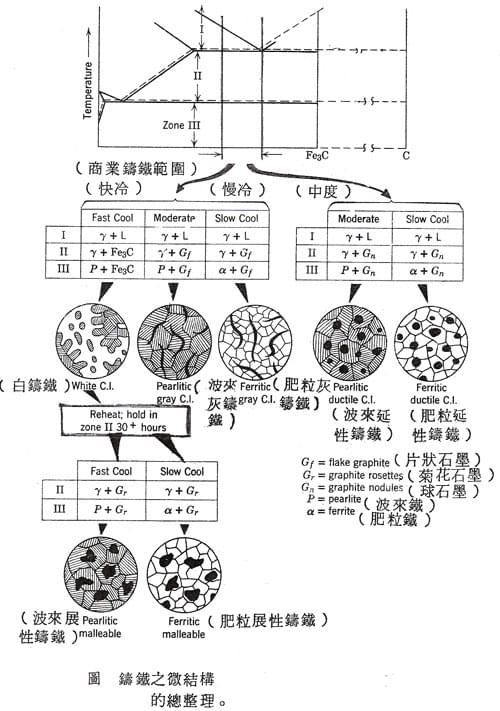 將3.02%C,1.64%Si,0.44%Mn,0.041%P,0.013%S之合金澆鑄於直徑30mm之濕模中,使用picral 腐蝕液,可見黑色片狀石墨與波來鐵基地。