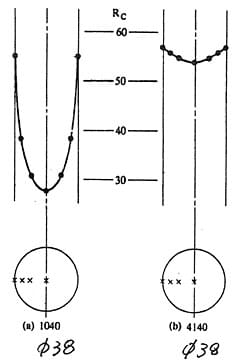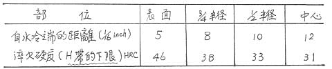 3.如為水淬火時,則可得中心部硬度H RC47,表面硬度HRC56。