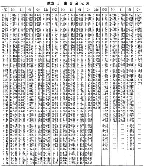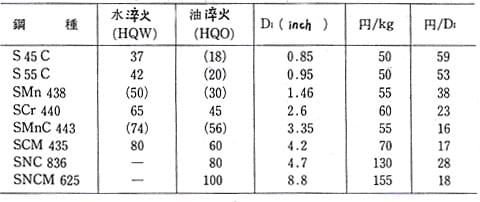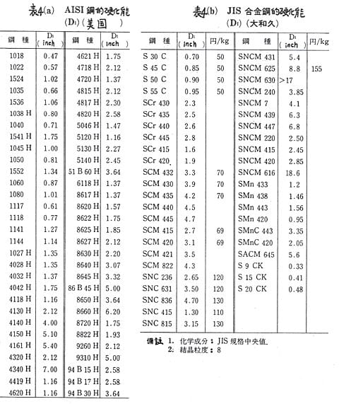 表4 為AISI鋼及JIS合金鋼的硬化能(DI值),DI值愈大時大致上硬化能愈好。