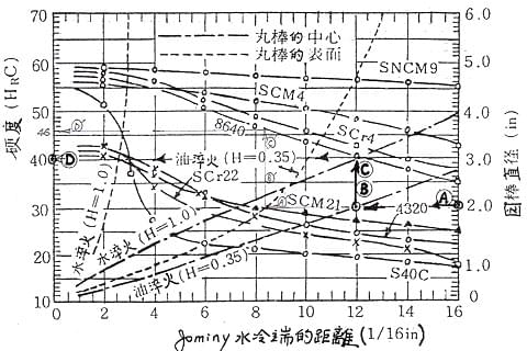 圖9 各種構造用鋼之Jominy曲線與圓棒淬火硬度之計算圖