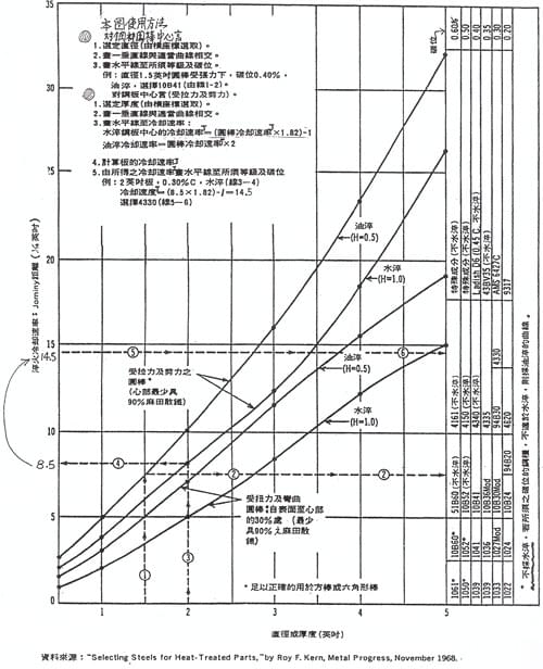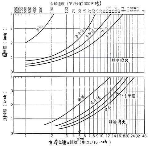 當已知鋼材之硬化能曲線及其淬火液之冷卻能時,可利用圖8求出該已知直徑鋼棒之中心硬度。